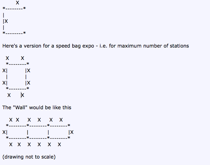 (...I'm not trying to be negative about the idea of building a speed bag wall, but I've dealt with the reality of doing such things in public locations. At a Dallas Sporting goods show I attended years ago, they allowed "assembly" of pre-made items (screwdrivers, wrenches etc), but no "construction" requiring carpentry equipment (saws, nailing etc.) My freestanding floor unit was attached to wooden plywood sheets that I had pre-cut and pre-drilled weeks before so I could "assemble" it there.)