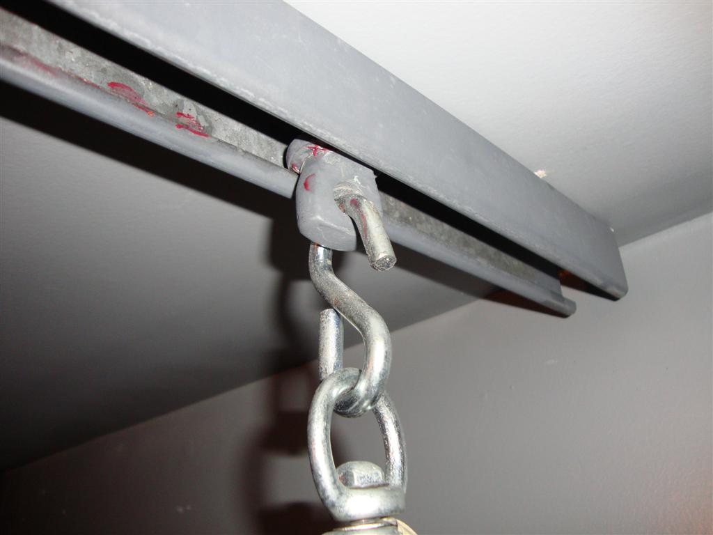That's Electrical Unistrut with a 4" shackle pin I cut down to about 1.5 inches... greased and works great to get it out of my way... Lag bolted it into my joist.