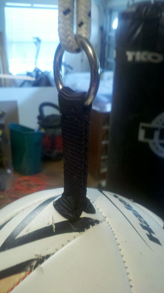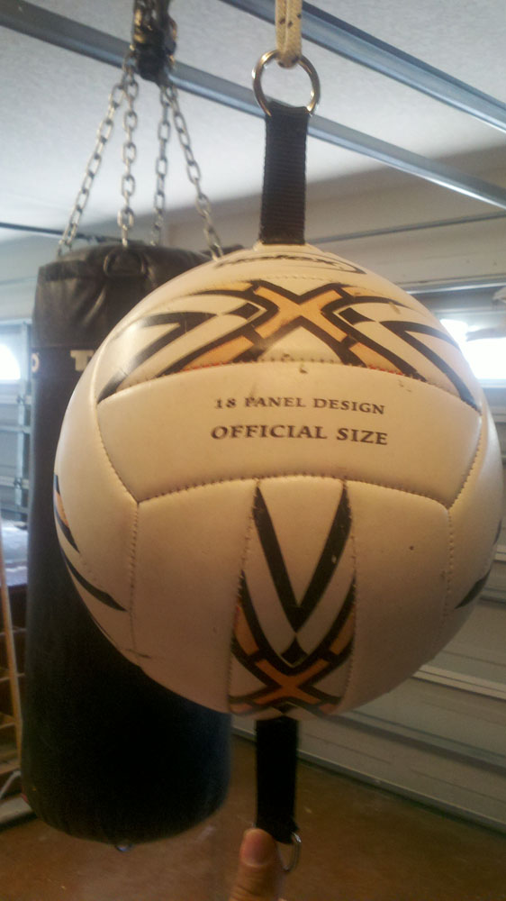 I deflated an old soccer ball and pulled the bladder away from the sides. I then disassembled an old dog collar I had laying around using the nylon and rings. I used a leather sewing awl to attach the nylon and D rings to opposite sides of the ball. Reinflated the ball and hung it from the ceiling. I use my bench vise to attach it to the floor (I haven't hit my foot on it yet... it works well so far!)