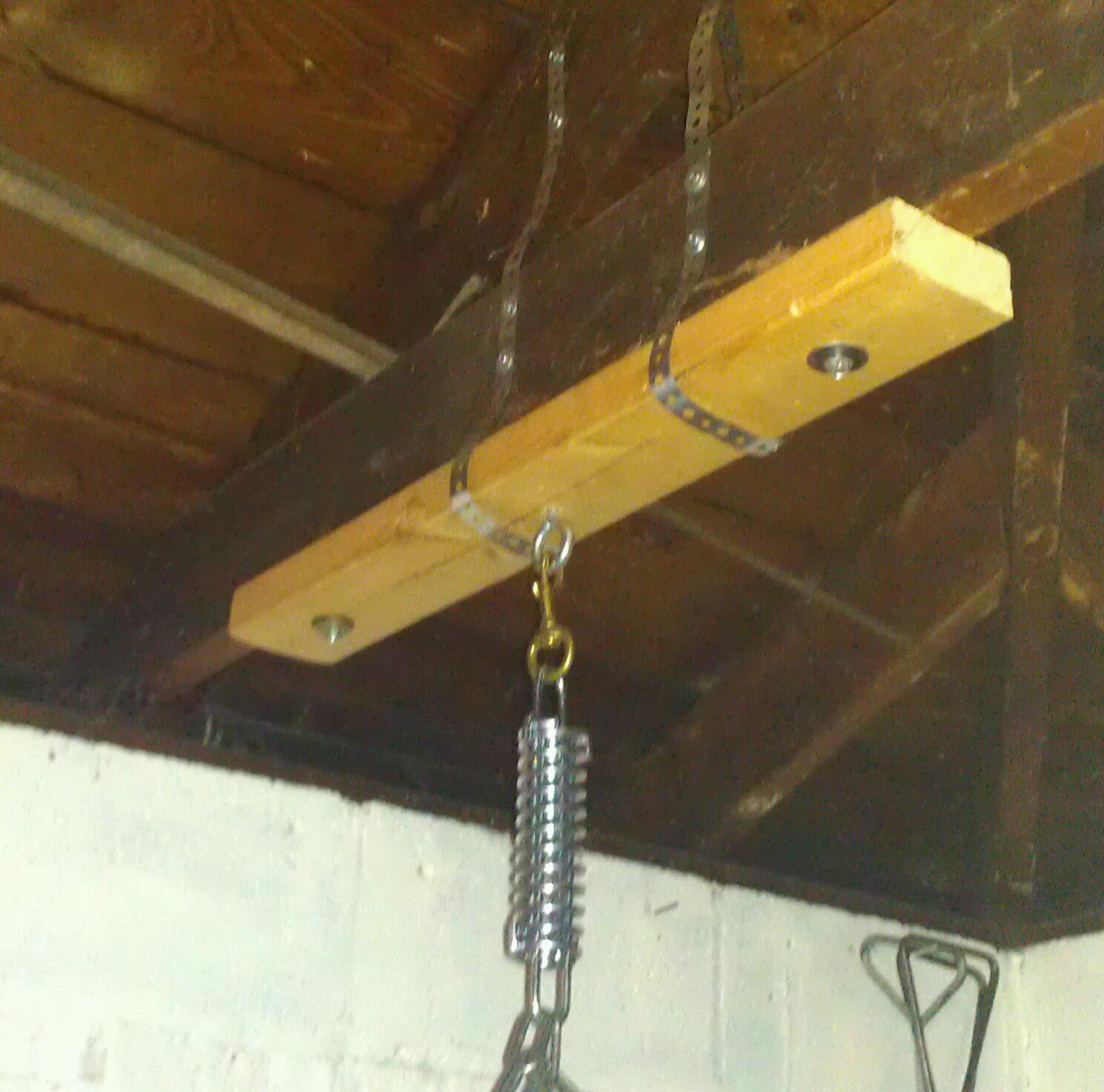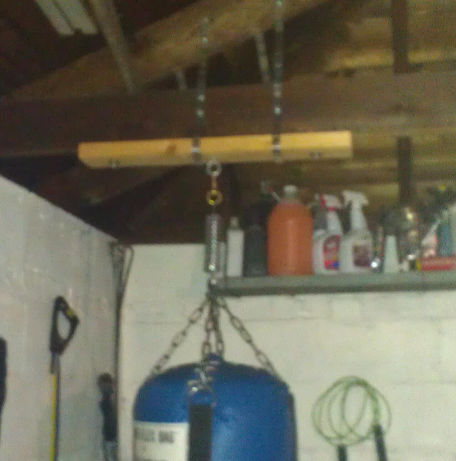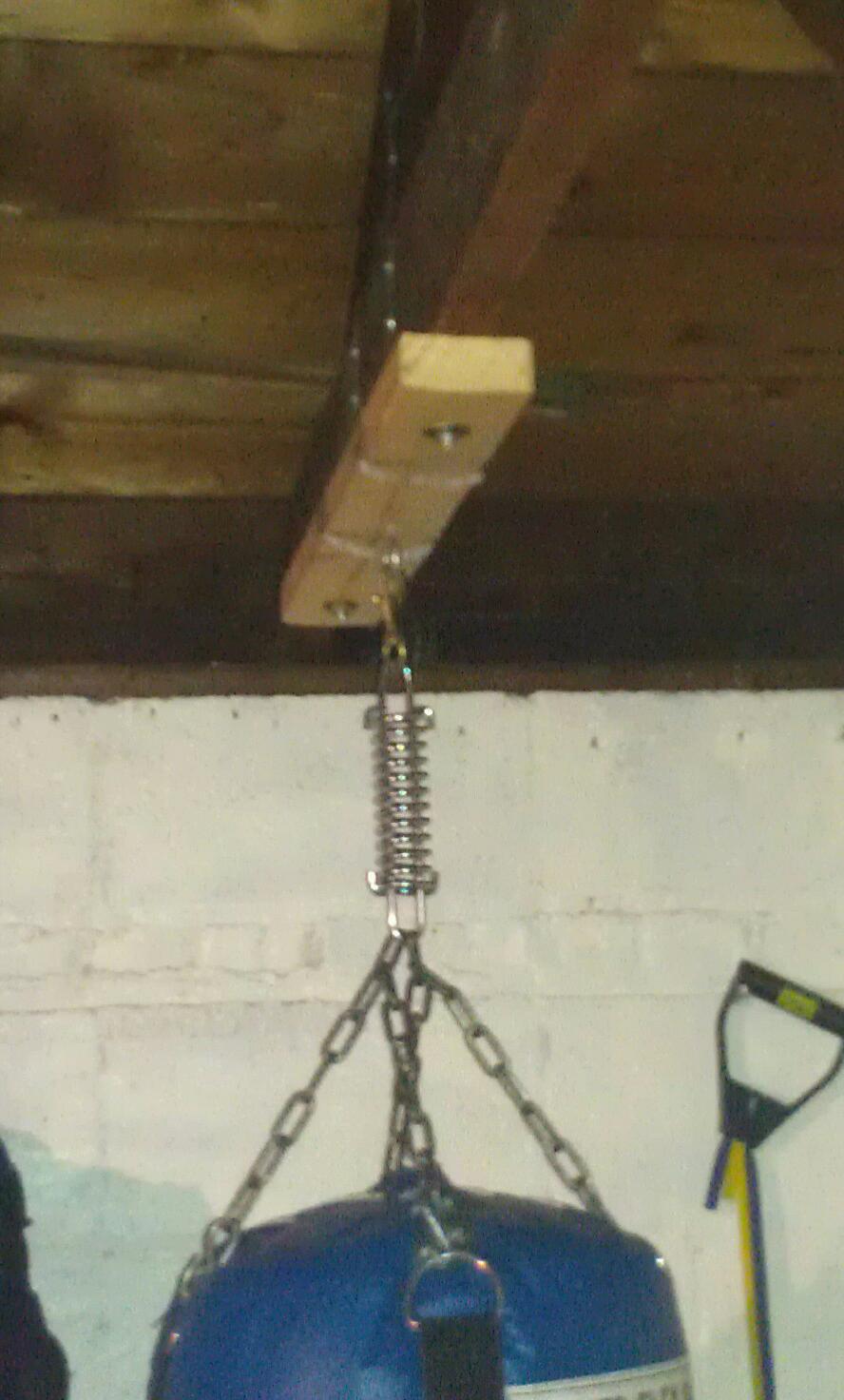 Nice setup. How is that spring holding up? I have a 100 lb heavy bag that i installed in between 2 joists. But when I am hitting it the whole kitchen floor is shaking like mad! I need to dampen this somehow.