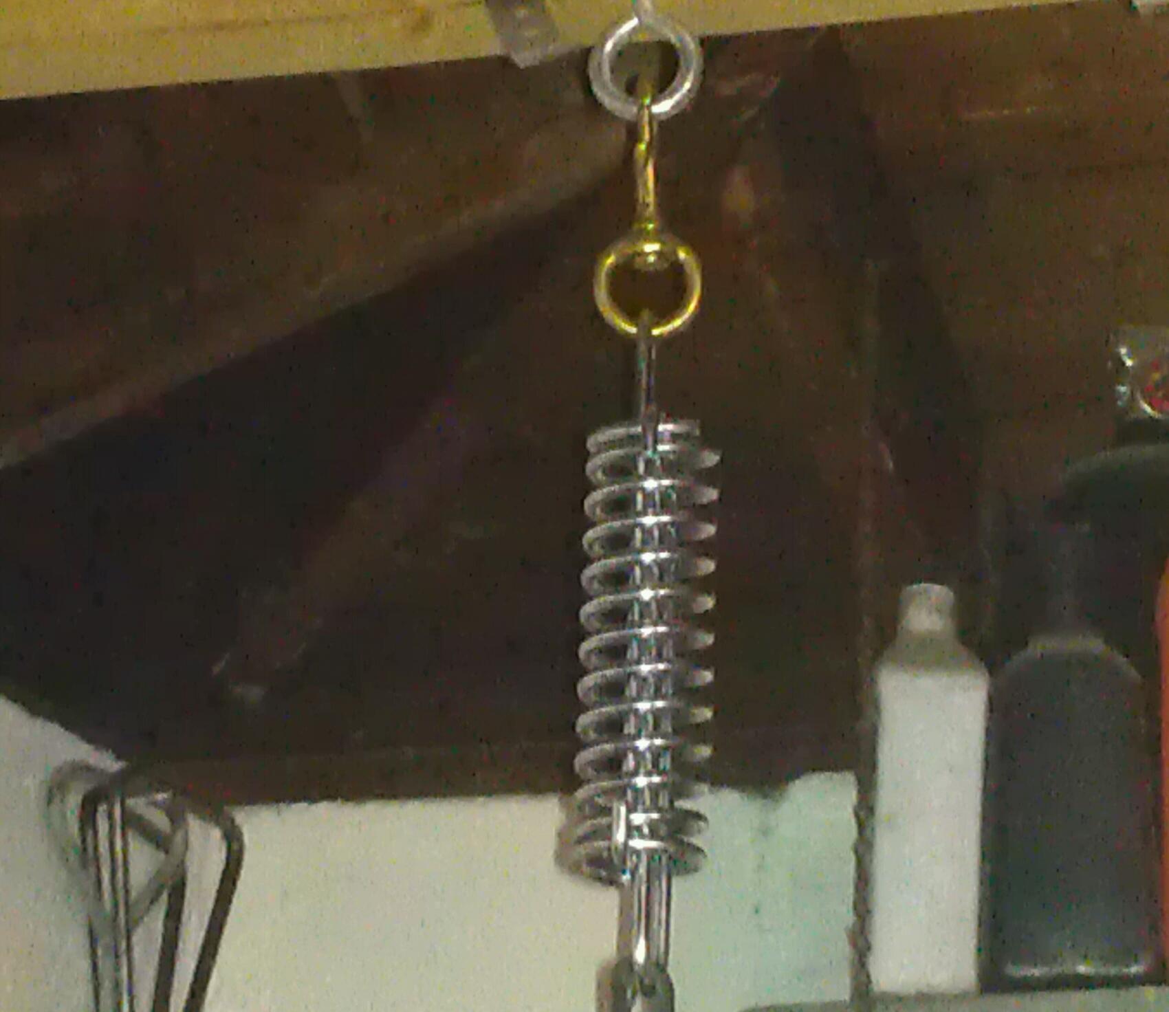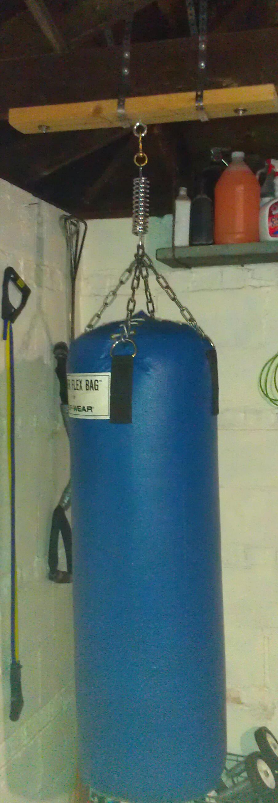 Ok, so I got this bag at a garage sale for $25.00 and have been dying to put it up. My Century stand doesnt have weights to hold it in place, so every time I hit the bag, I was chasing the stand. Plus the bag was hanging too low. Got as cople of porch swing springs from Lowes. each spring is rated up to 300lbs, my bag weighs about 100 at the most ( I personally think it's about 60-80). this is how i hung it: