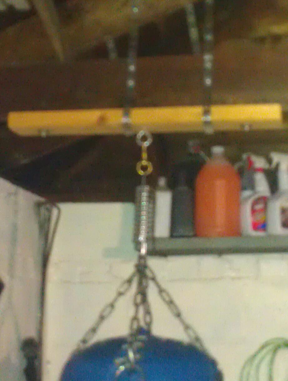 The spring's awesome. It's rated at 300#. However, the beam needs to be reinforced. When I would hit it, the bag itself was fine, the spring was holding up good but the beam I attached it to would start to vibrate really bad. I took it down and got some 2x4s to reinforce the crossbeams. Haven't set it up yet but will post pictures when I doOriginally posted by Mogie View PostNice setup. How is that spring holding up? I have a 100 lb heavy bag that i installed in between 2 joists. But when I am hitting it the whole kitchen floor is shaking like mad! I need to dampen this somehow.sigpic
