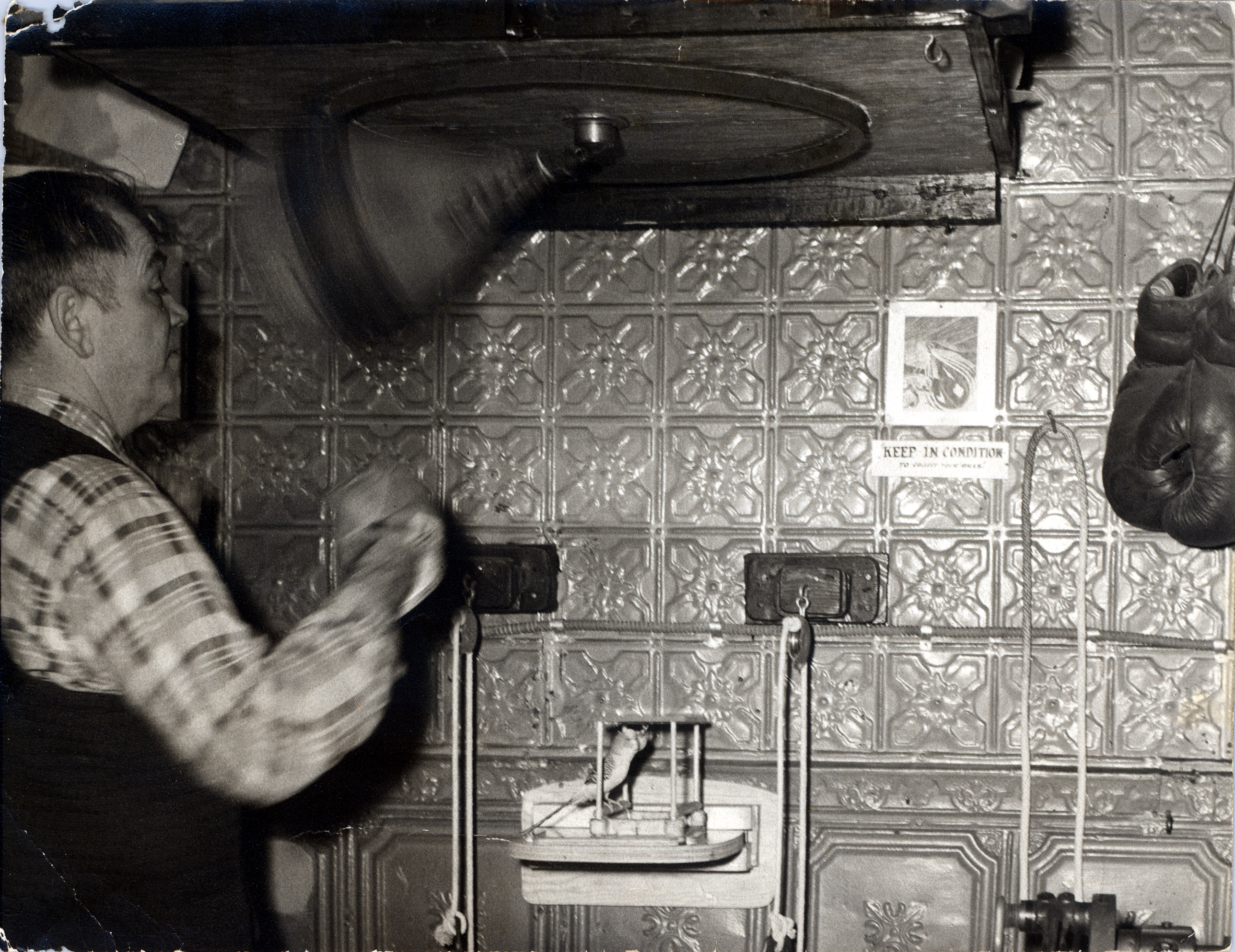 Yes, that's a live budgerigar with its own speed bag platform punching along with the old master. One of a kind photo, can anyone make out the fine print under the KEEP IN CONDITION sign?
