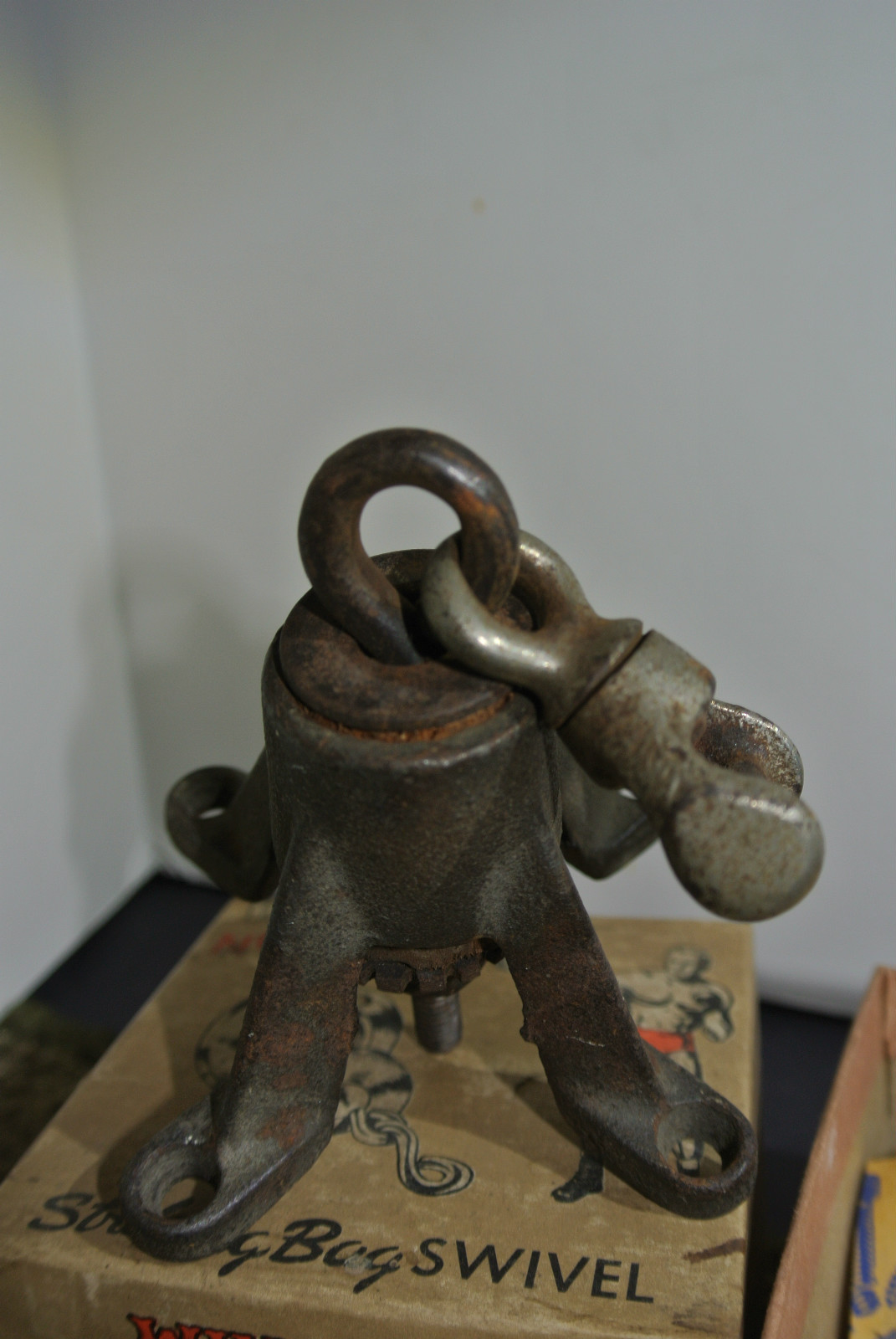 Was wondering about this set-up. Perhaps it's not a speed bag swivel at all, and someone just stored it in the Whitely box leading the seller to assume that it was.Originally posted by paranday View PostThe drawing on the box shows a Whitely ball hook swivel, not the swivel that is for sale. The swivel for sale looks like it needs a bag with a belt that opens, not a fixed loop like we have today. Could still maybe use it by cable tying the bag to the swivel. Rare item.