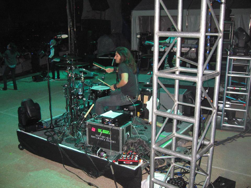 We hooked before the show for a few hours of baggin backstage. What an awesome setup! The best equipment truck in Rock & Roll was backed right up to the main stage. (pic 1). This was great because there was several rockin' bands on before the "headliner" band (Foreigner) and that gave us a whole lotta live music to punchdrum with. We had a ball swapping off punch drum sets together in between learning a few new combinations (pic 2). I can tell ya, BT is really putting the bag beat to music with some very cool combinations, mixing all kinds of combo's. This went on for almost three hours, but then that ends cause BT has to go to work.