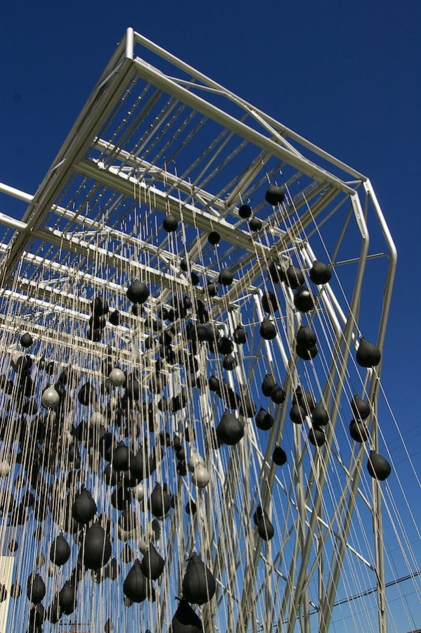 "A 22-feet-tall portrait of Muhammad Ali made of 2 miles of aluminum tubing, 5 miles of stainless steel cables, and 1,300 speed bags.