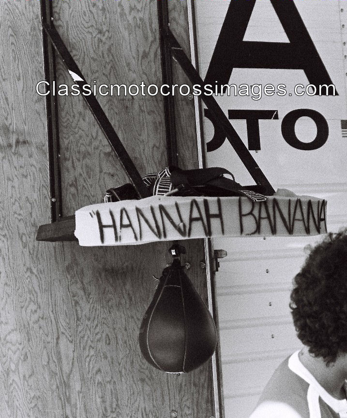 "Later in '77 I took this shot of Hannah's speed bag hanging off a door on the Yamaha Support Van. I never saw him use it but it had to be something of note by other riders seeing this "bull bag" in the pits. By this year Hannah seemed to be winning most of the time."