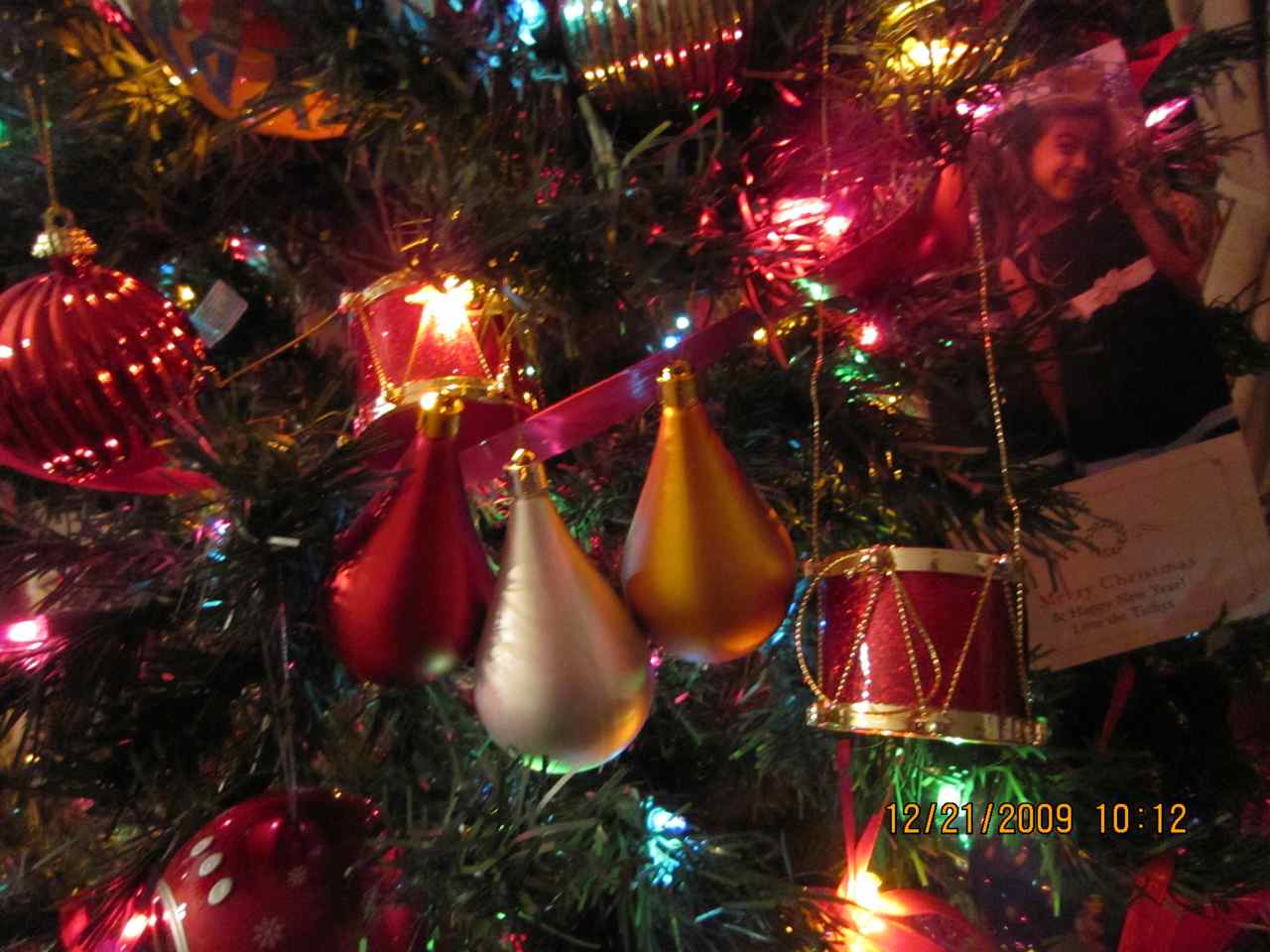 But look closer.... Yeah, I'm a drummer so there has to be some drum ornaments hung, but what's this? There are 3 of them grouped together!