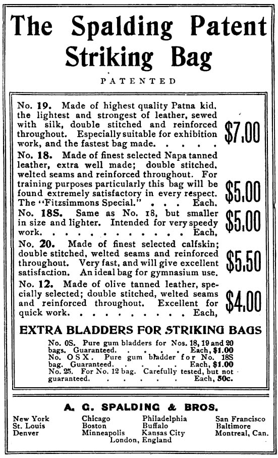 From an advertisement a year later we can see how these particular early bags were fastened to the rope, and why. There was no leather loop on these Spalding bags. From the price list, we can see that "very speedy work" was important to baggers back then. What cracks me up is that the bladder for the budget bag was "carefully tested, but not guaranteed".