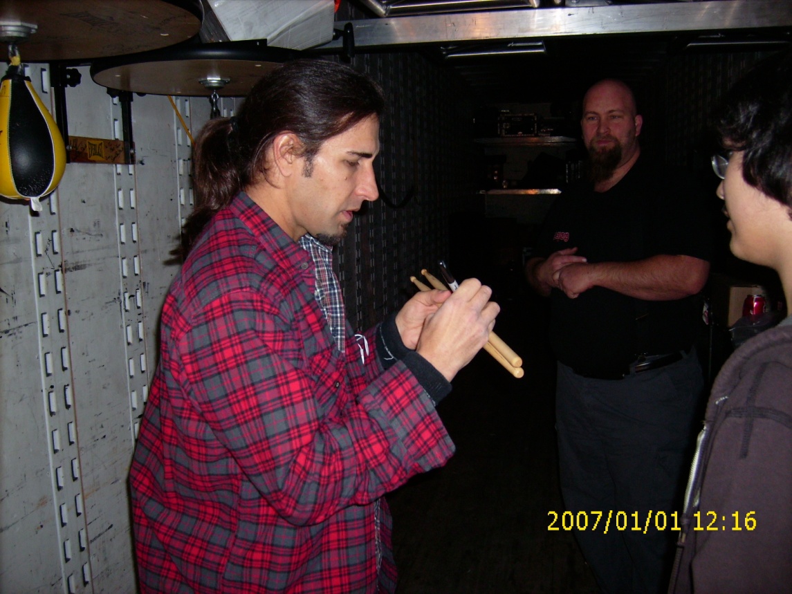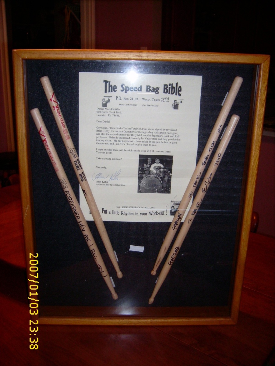 Brian Tichy is seen signing drum sticks in the Speedbag Truck for my grandson, Daniel, who is a percussionist in 8th grade and will continue in high school. Foreigner was in San Antonio on Feb 12 and Brian got us in to the concert even though he was very busy that evening. Also there in Brian's crew was Speedbagtrucker. Both of them gave Daniel and me quite a speed bag demonstration. Brian also showed a side to side punch roll that was amazing. Never seen it before.
