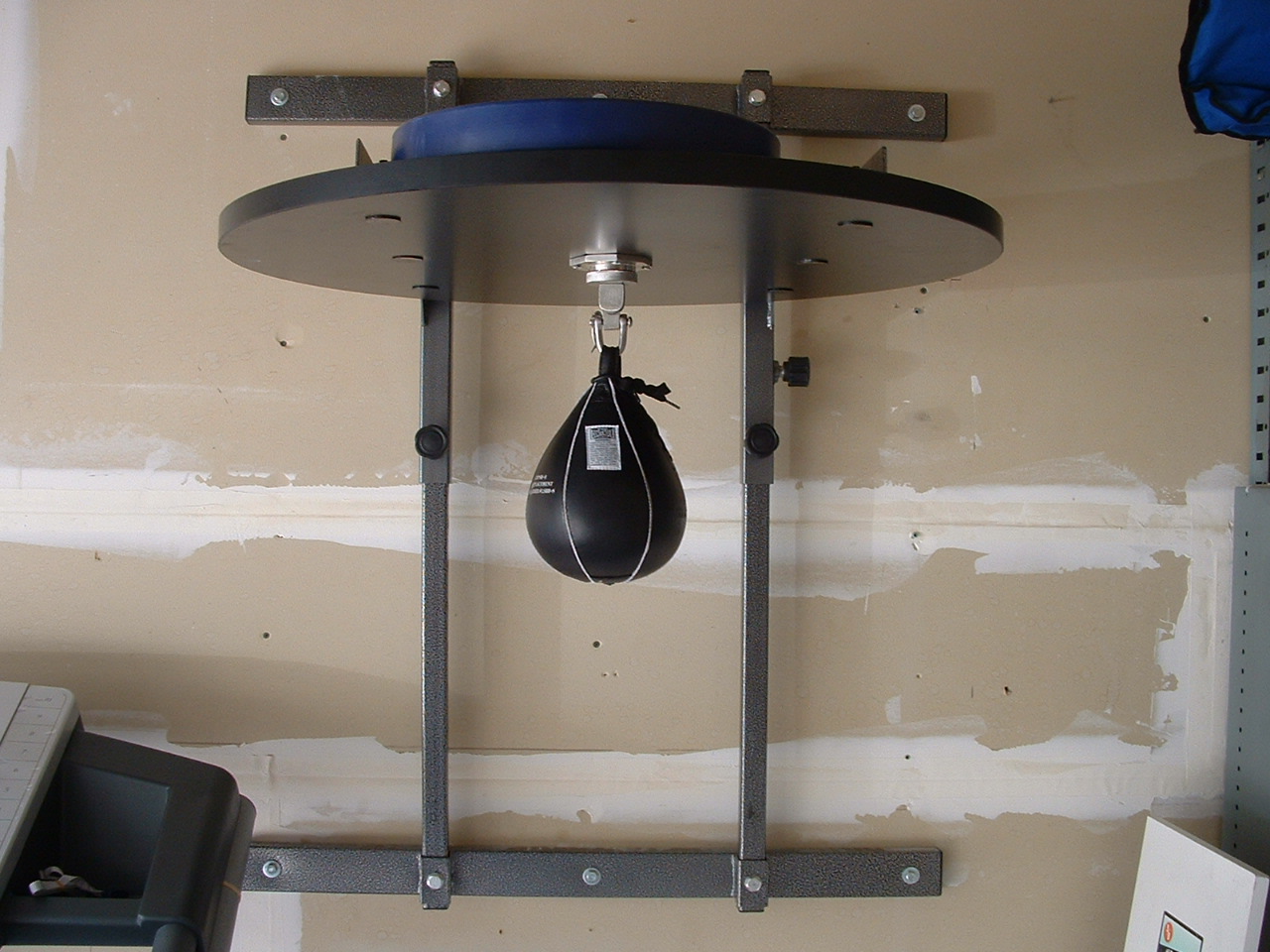 this is my set up consisting of the top contender adjustable speed bag platform. as you can see it is weighted down with 60 pounds of olympic weights, tied down with a rubber cable. those weights aren't going anywhere. in the other photos you can see the heavy bag stand by century. the century also came with a speed bag platform, which i got rid of, a long time ago, nordic trac treadmill, and a weight bench. on the opposite side of the garage is a double endbag platform. and my pride and joy, the glove case and pics autographed by manny pacquiao, luisito espinosa, and brian viloria.