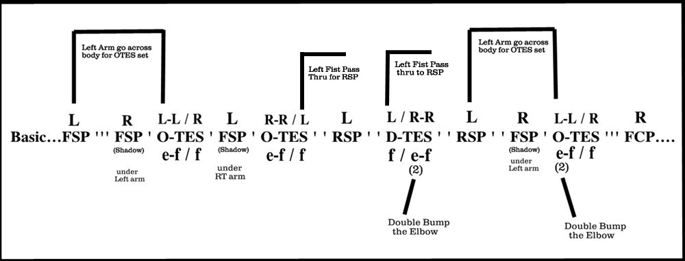 This combo shows the use of Front Straight Punch (FSP) as a "shadow" or "phantom" punch (means the same thing, it's under the other arm) and a few double bump elbows.