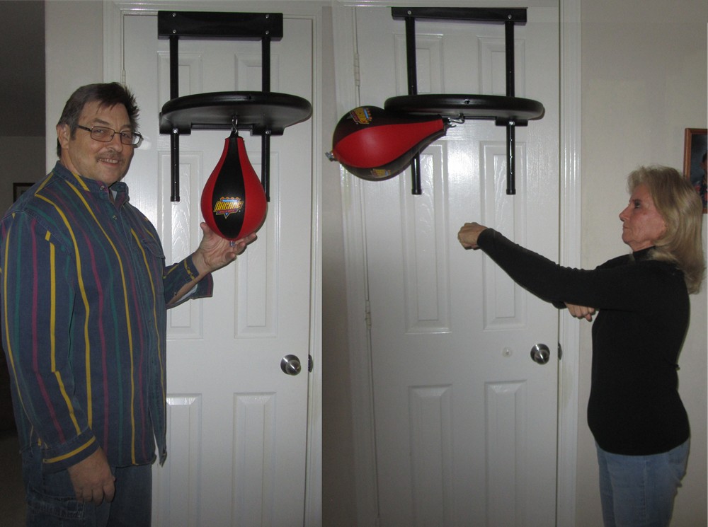 Believe it or not, .... it works for it's purpose of a fun activity. (not a serious workout). And it would be good for little kids with the exception that most small children couldn't reach it hung at the top of door. And it has an interesting swivel design, that drops in from the top. Actually works OK for this light setup. The one adaption it really needs is an adjustable tension strap to go around the bottom section of the vertical braces, for it kicks up off the door at the bottom. But, if you hold the vertical braces down tight, it works amazingly well. Of course the light balloon bag goes well past the edge of the board, but a bit smaller bag or larger board would fix that also. This does prove to me that a door hanger model IS possible, although it will be noisy and vibrate the door.Last edited by Speedbag; 01-11-2013, 03:02 AM.Speed Bag