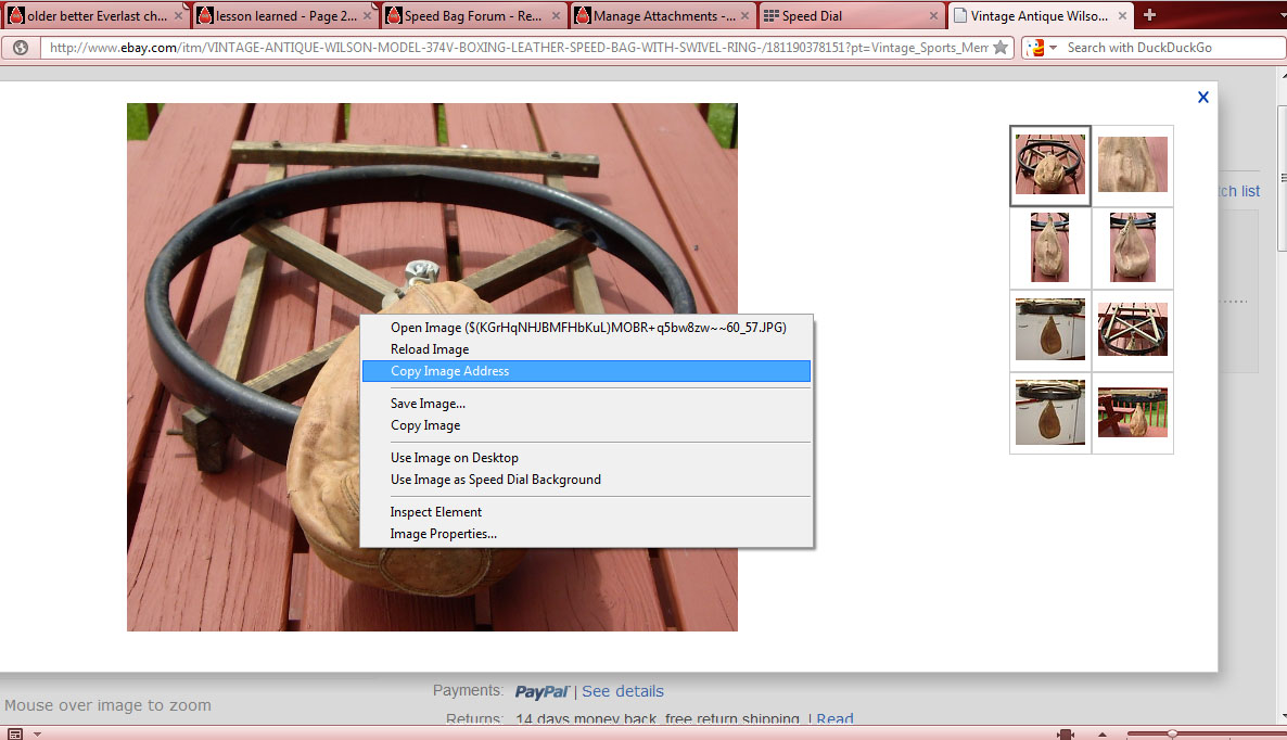 I don't know how to bring over the photo of the add from Ebay but I just pulled the trigger on a speed bag swivel (and an old bag that looks to damaged to be of any use). The swivel looks like the Nicols 3 screw Swivel with the exception that there is no knurling on the part of the swivel that unscrews from the embossed base. It's a dead ringer for the Nicols with the exception of this lack of knurling. The embossed base and the way the S hook is fastened with a nut looks identical. I'm wondering if anyone has any info on the Moosehead-Whitely swivel. It cost me fifty bucks but I really like the old Nicols swivel that I previously got and this one looks like it is in pretty good shape for something so old.