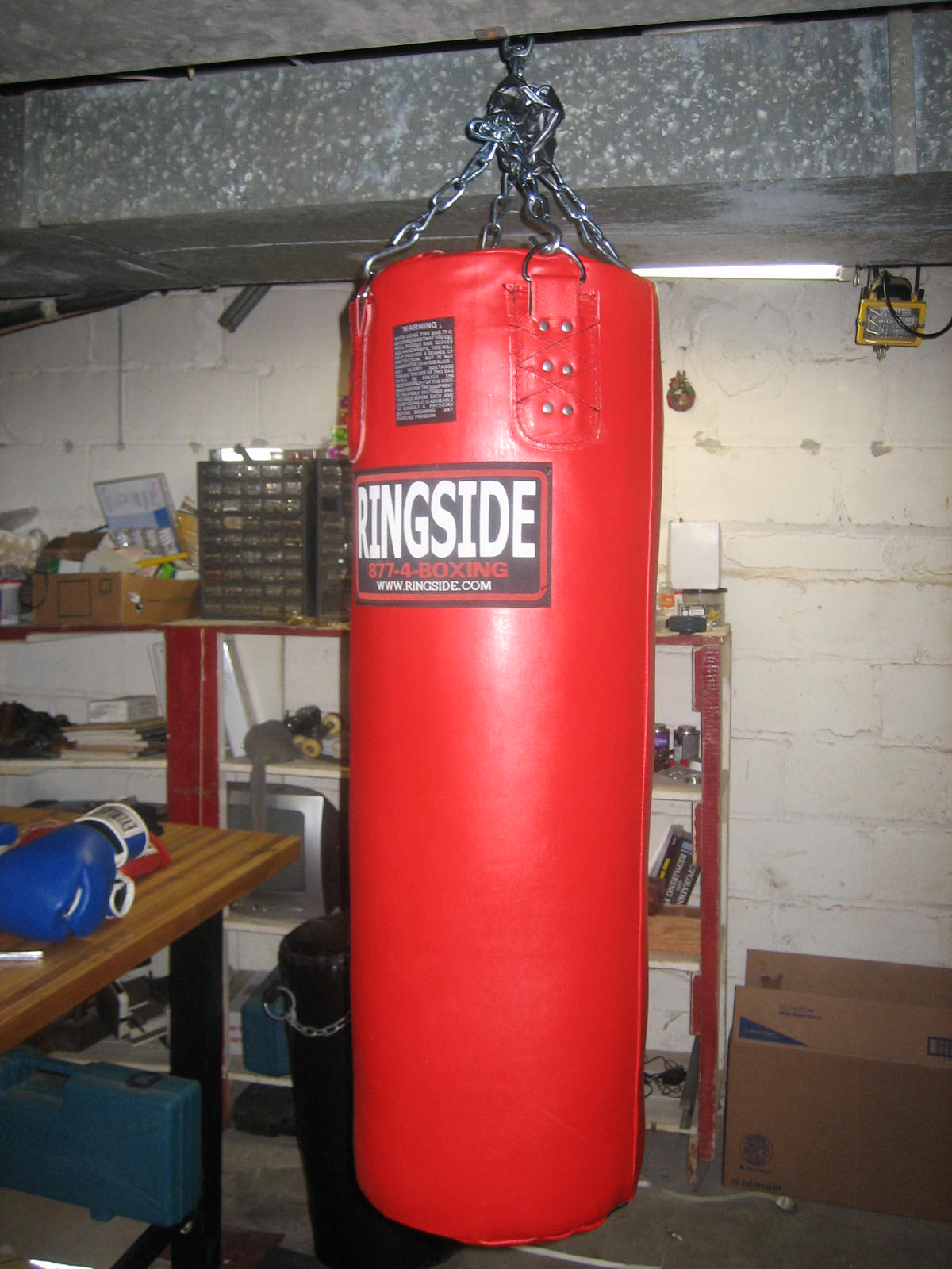 p.s., In the picture you may wonder what's going on with the chains. I shortened up the chains so I could get the bag a little higher so I used a couple of snap rings I had laying around to shorten the chains and raise the bag by about six inches. To keep the excess chain from rattling, I taped them up in a ball with duct tape. It was a lot easier to do it that way.