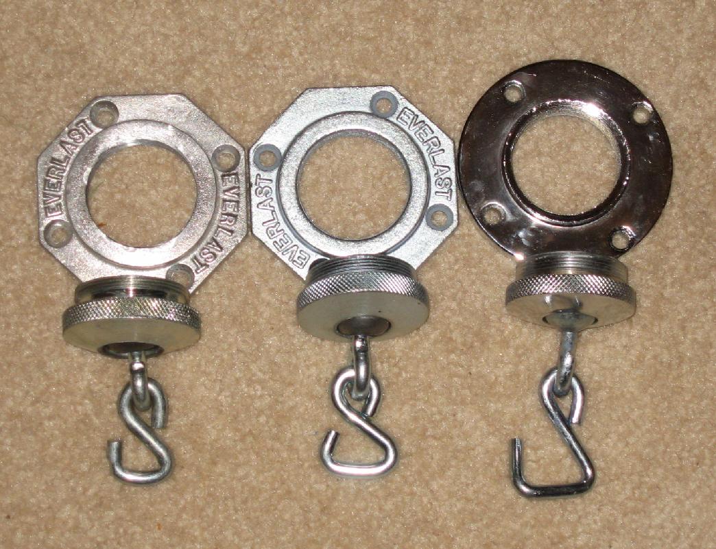 The picture on the right has three swivels, and I added it to show the variation in Hook shapes. The older everlast on the left, is more of a true "S" hook, which dominated for many many years. It was great for the older bags with the more narrow strap attachments. The center Everlast (the same one as the picture on the left) is the last version of the Hook before they went to plastic. Notice it is a broader, flat "S" bottom, with a very narrow attachment clearance. Very difficult to get a thick strap bag on this.. On both of these Everlast BH, I have moved the shank as far up into the ball as possible. I always do that, to shorten the rebound arc. (faster)