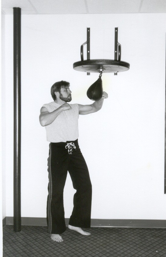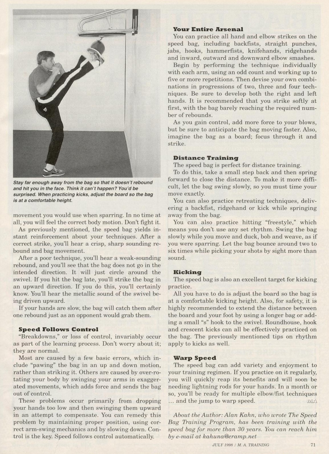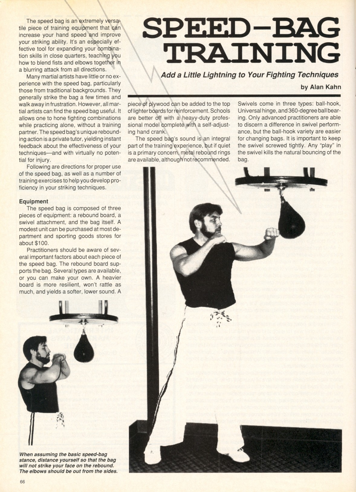 I had the good fortune of having that article reprinted in a "sister" magazine of Black Belt (Martial Arts Training) in 1998, and I asked to re-shoot the photo's. I then used my trust big red 4210, the same bag in the technique pages of The Speed Bag Bible. I also shot those pictures in my garage, not a public health club. (pics below)