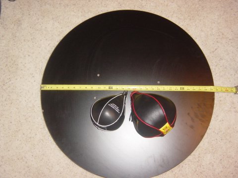 As you can see here, it's crazy large for a 4x7 and 9x6 bag. The tape measure is crooked in this picture, but I did measure several times, it's 29.5" diameter, 1 7/8" thick. (At this point you may think I'm a bit obsessed about it, but that comes from being a computer science major and programmer... If it's 29.5" call it 29.5" , not 30"!) The drum is "melamine", which is some sort of coated particle or chip board, I guess.