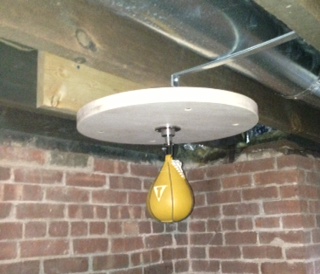 Here's my new home set up. 1 1/2" maple, 24" diameter. Bolted straight into the rafters of a pretty low ceiling. Works great, really solid, really quick. Getting ready to stain and finish the wood, any suggestions?