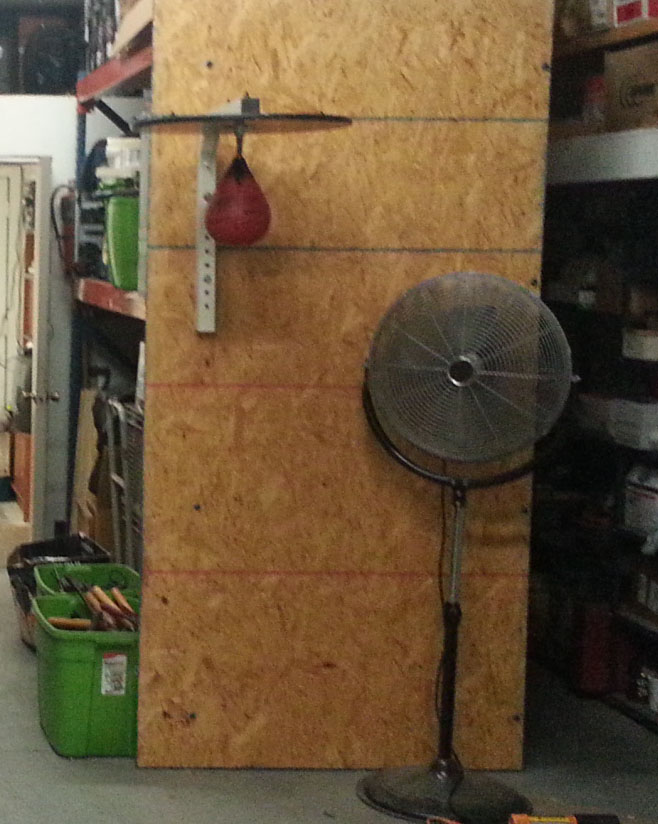 (long story)PS: here is a pic that I had--I'll have to get one of better quality. The hanging arm is from the aforementioned heavy bag stand, through bolted to the pallet rack. Fan is conveniently close for cooling...