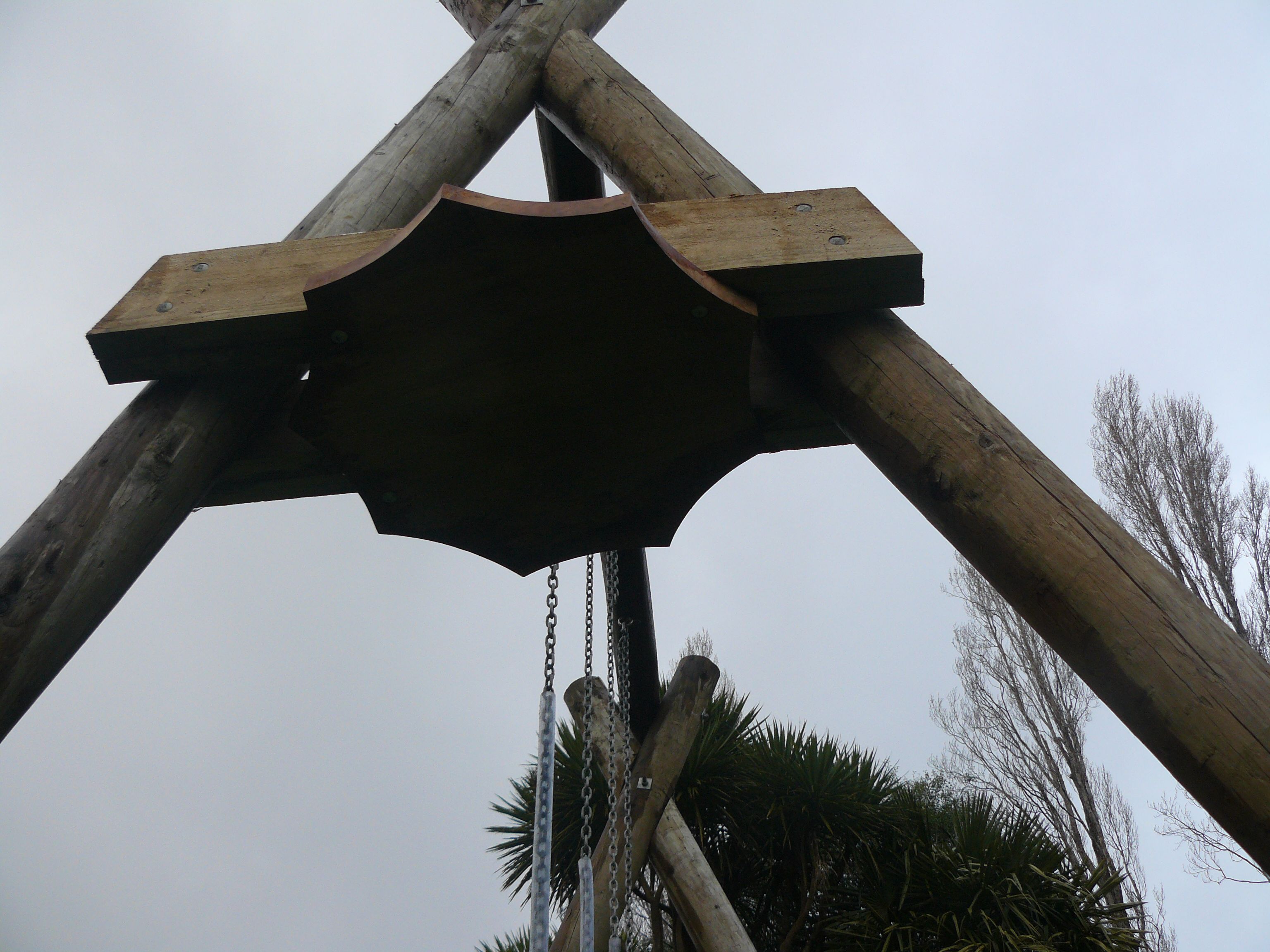 Are these photos bigger? If not then it's because I have no computer skills The horizontal beam at the top is nearly 4m from the ground so the swing goes big and fast. The kids love it and so do the big kids lol. Getting the top pole in place was a feat of solo construction but with the help of a bit of rope I got em. Above the nonagon is 100lb of concrete I poured in just to add mass and to key the timbers together.